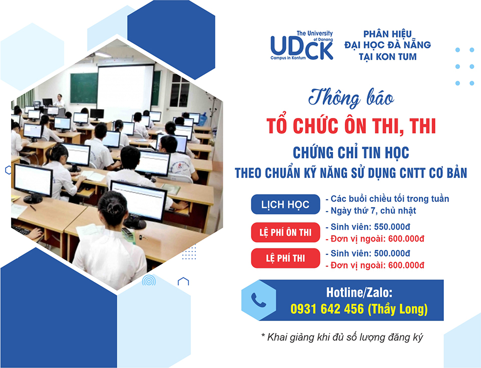 Phân hiệu Đại học Đà Nẵng tại Kon Tum phối hợp Trung tâm Tin học trường Đại học Quy Nhơn tổ chức mở lớp ôn thi và thi cấp chứng chỉ Tin học theo chuẩn kỹ năng sử dụng Công nghệ thông tin cơ bản theo Thông tư số 03/2014/TT-BTTTT ngày 11/3/2014 của Bộ trưởng Bộ Thông tin và Truyền thông.