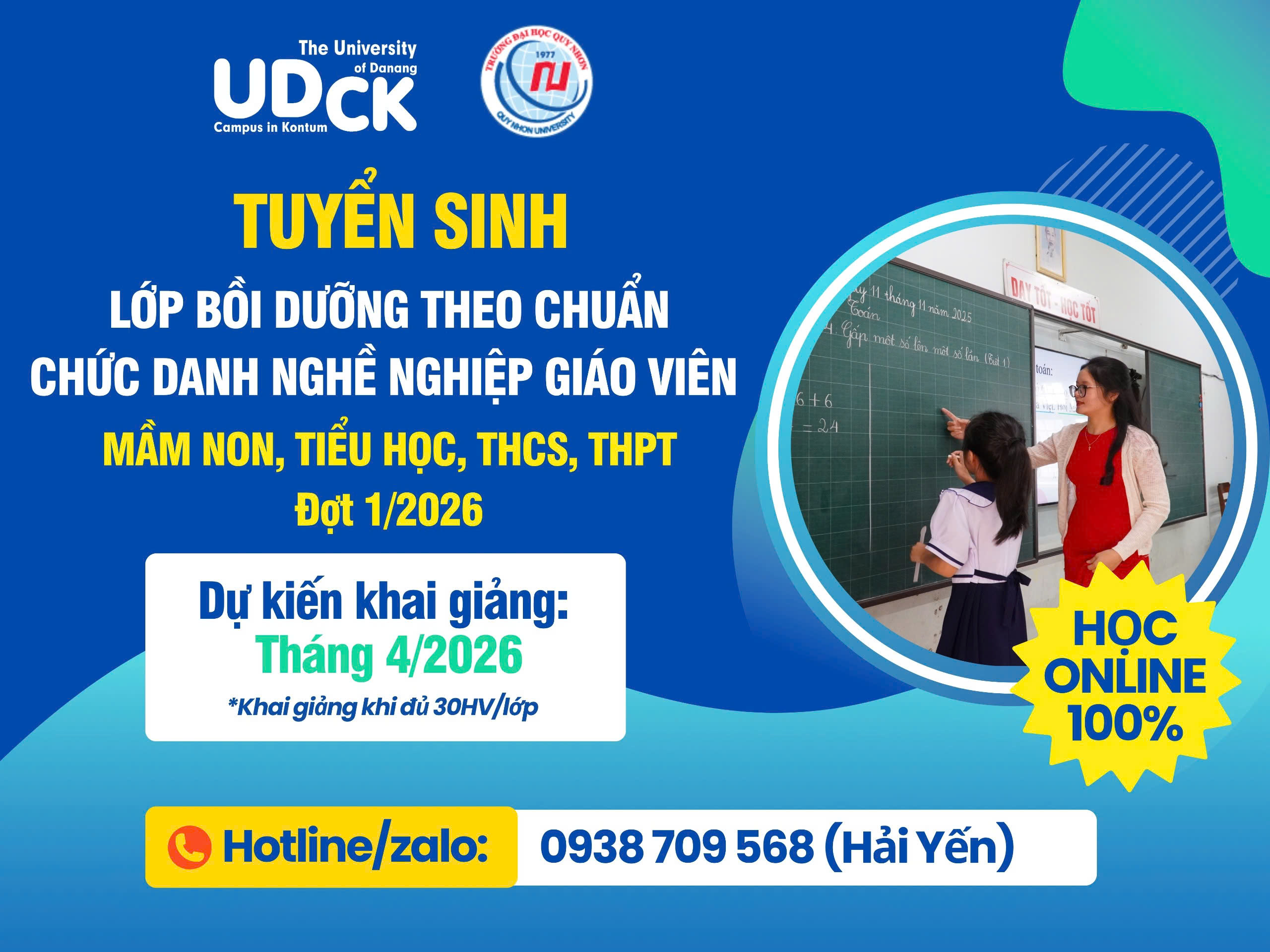 Chi tiếtPhân hiệu Đại học Đà Nẵng tại Kon Tum phối hợp với Trường Đại học Quy Nhơn mở lớp Bồi dưỡng theo chuẩn chức danh nghề nghiệp cho giáo viên mầm non, tiểu học, THCS, THPT đợt 1 năm 2026.