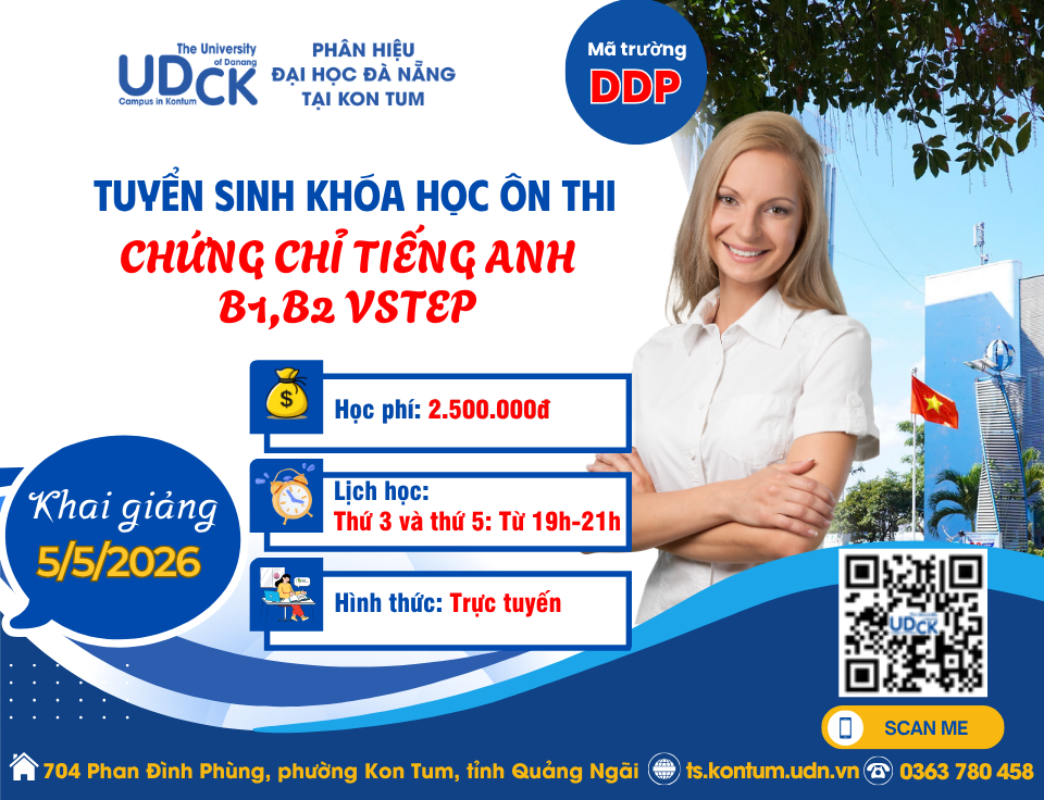 Chi tiếtPhân hiệu Đại học Đà Nẵng tại Kon Tum thông báo mở lớp ôn thi chứng chỉ tiếng Anh B1, B2 theo khung năng lực ngoại ngữ 6 bậc dùng cho Việt Nam đợt 1 năm 2026